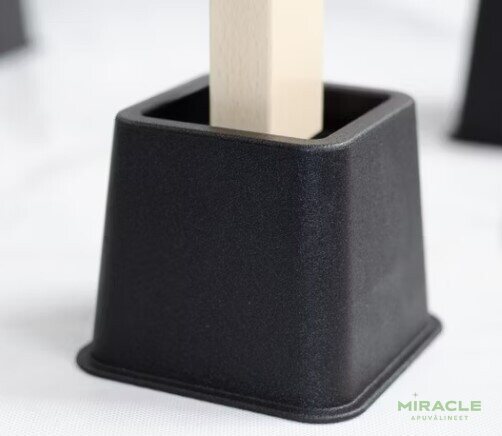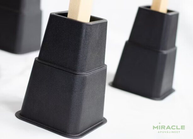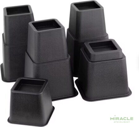 Tämä huonekalukorottajasetti sisältää 8 kappaletta korottajia, joilla nostat kätevästi huonekalun korkeutta. Korottajat ovat mustaa muovia ja niihin kuuluu 4 korkeaa ja 4 matalaa korottajaa. Jalkojen halkaisija voi olla enintään noin 7 × 7 cm ja korkeutta on mahdollista säätää noin 7-20 cm. Yksi jalka kestää enintään 100 kg painon ja koko setin maksimikuormitus on 400 kg. Huonekalukorottajat pitävät huonekalusi tukevasti paikoillaan ja helpottavat esimerkiksi sängystä/tuolilta nousemista ja siihen istumista.