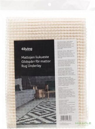 4Living mattojen liukueste pitää matot paikoillaan ja ehkäisee liukastumisia. Tämä verkkomainen liukueste on helppo leikata sopivan kokoiseksi ja se sopii myös hyllyjen suojaksi. Maton mitat ovat 120x180 cm ja korkeus on 0,5 cm. Paino on kevyt 0,49 kg, ja väriltään se on valkoinen. Valmistettu laadukkaasta materiaalista, joka koostuu 30 % polyesteristä ja 70 % vinyyliltä.