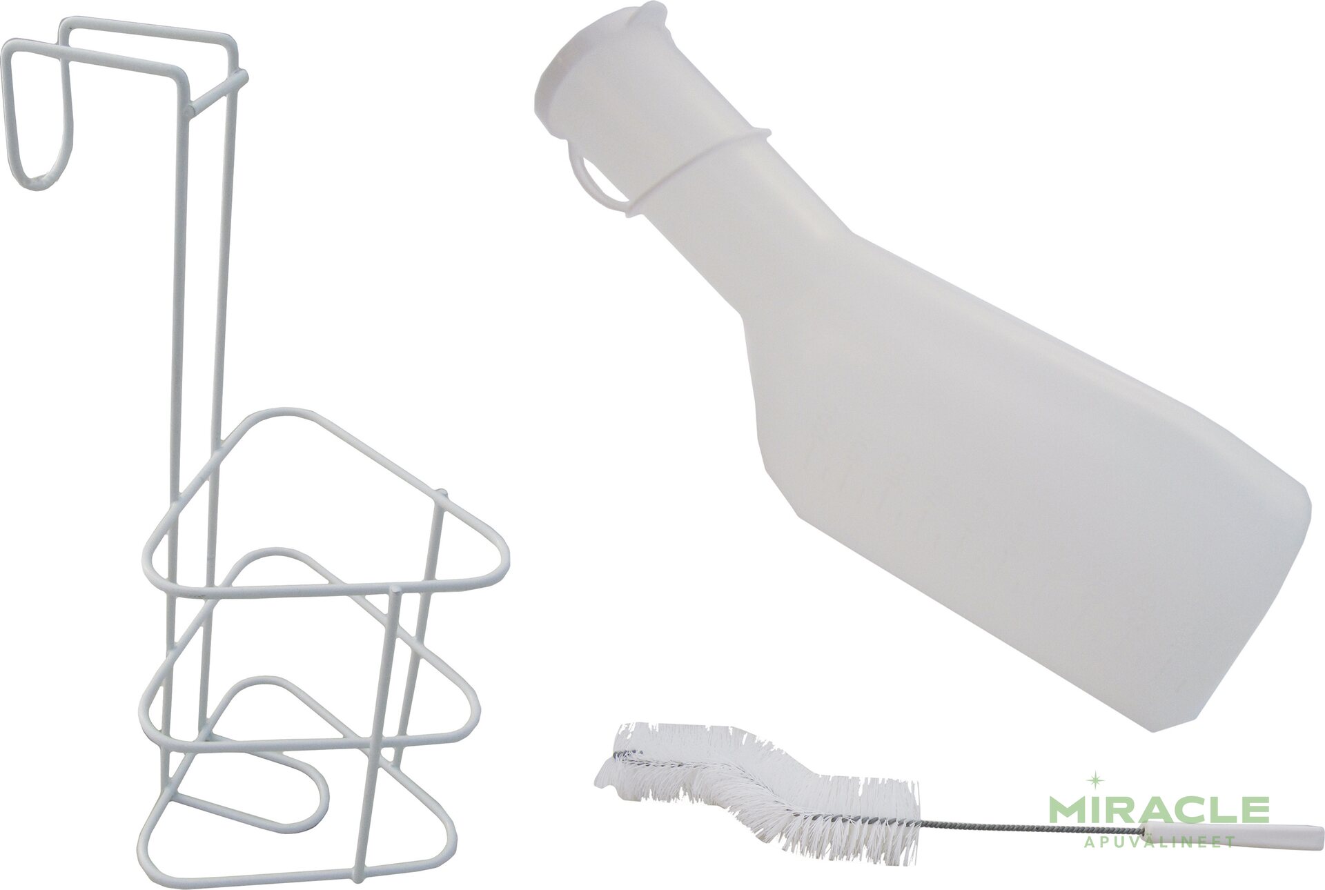 Miesten virtsapullosetissä on virtsapullo, virtsapulloteline ja pulloharja. Virtsapulloteline on valmistettu metallista, jossa on kestävä muovipinnoite. Telineen halkaisija on noin 13 x 13 cm ja korkeus noin 33 cm. Virtsapullo on kannellinen ja sen tilavuus on 1000 ml. Pullo on väriltään valkoinen ja se kestää pesua jopa 90°C asti. Settiin kuuluu myös pitkävartinen pulloharja, jossa harjaosa on noin 6 cm, ja kahva on valmistettu kestävästä muovista. Harjan kokonaispituus on noin 45 cm, ja sen varsi on valmistettu metallilangasta.