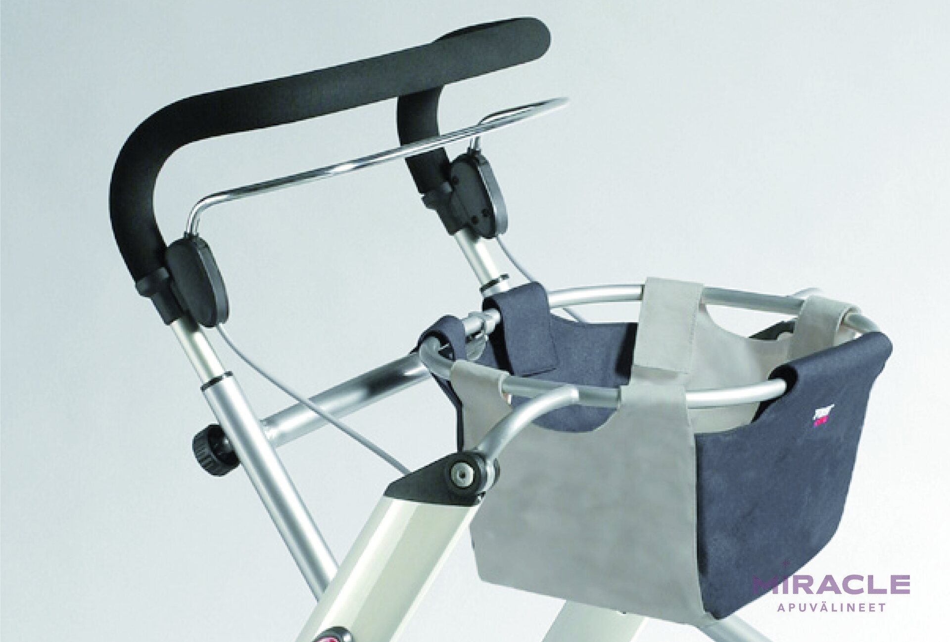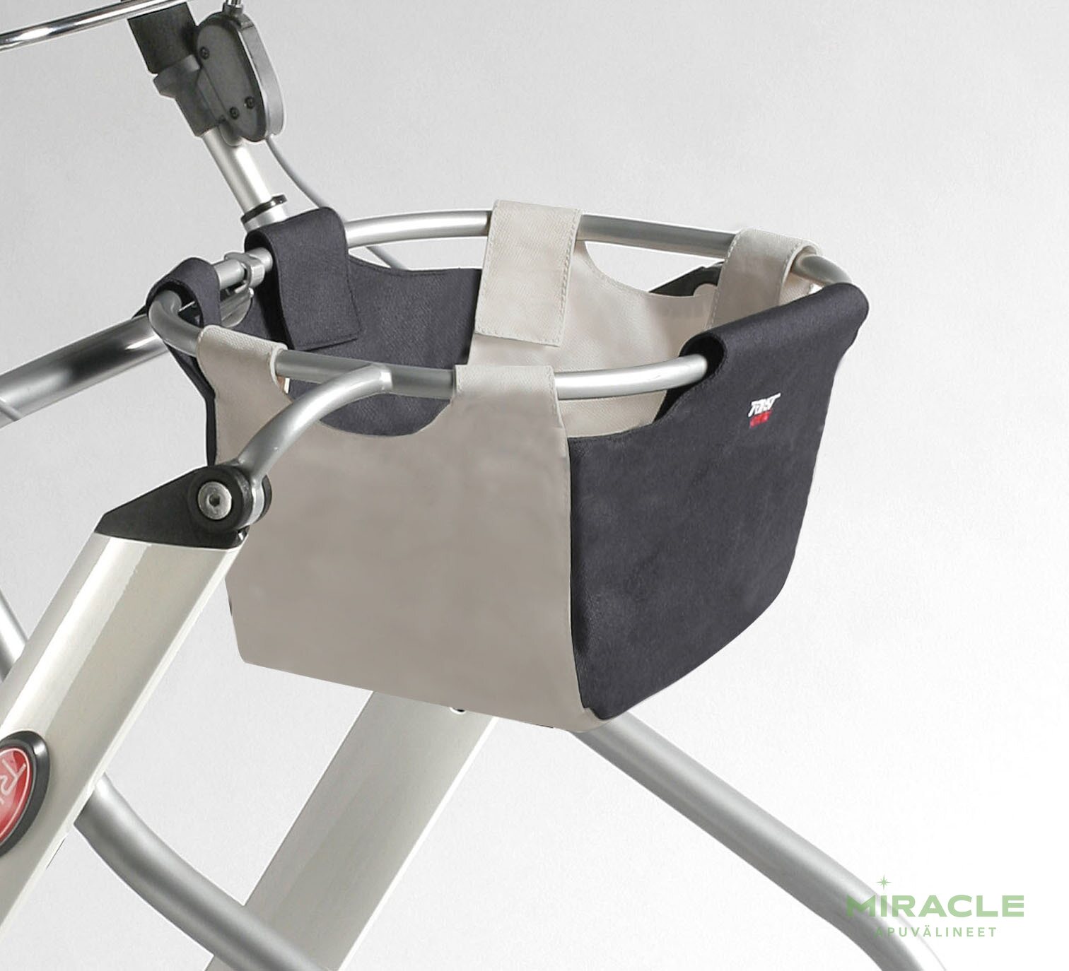 Let's Go -rollaattoriin lisäosana myytävässä kangaskorissa kuljetat kätevästi mukanasi esimerkiksi puhelimen ja sanomalehdet. Kori on helppo asentaa tuotteessa olevalla tarrakiinnityksellä.
