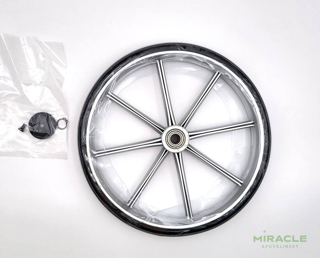Eturengas Materiaali: Muovi, kumi Väri: Hopea, musta Sisältää laakerin ja kiinnikkeet
