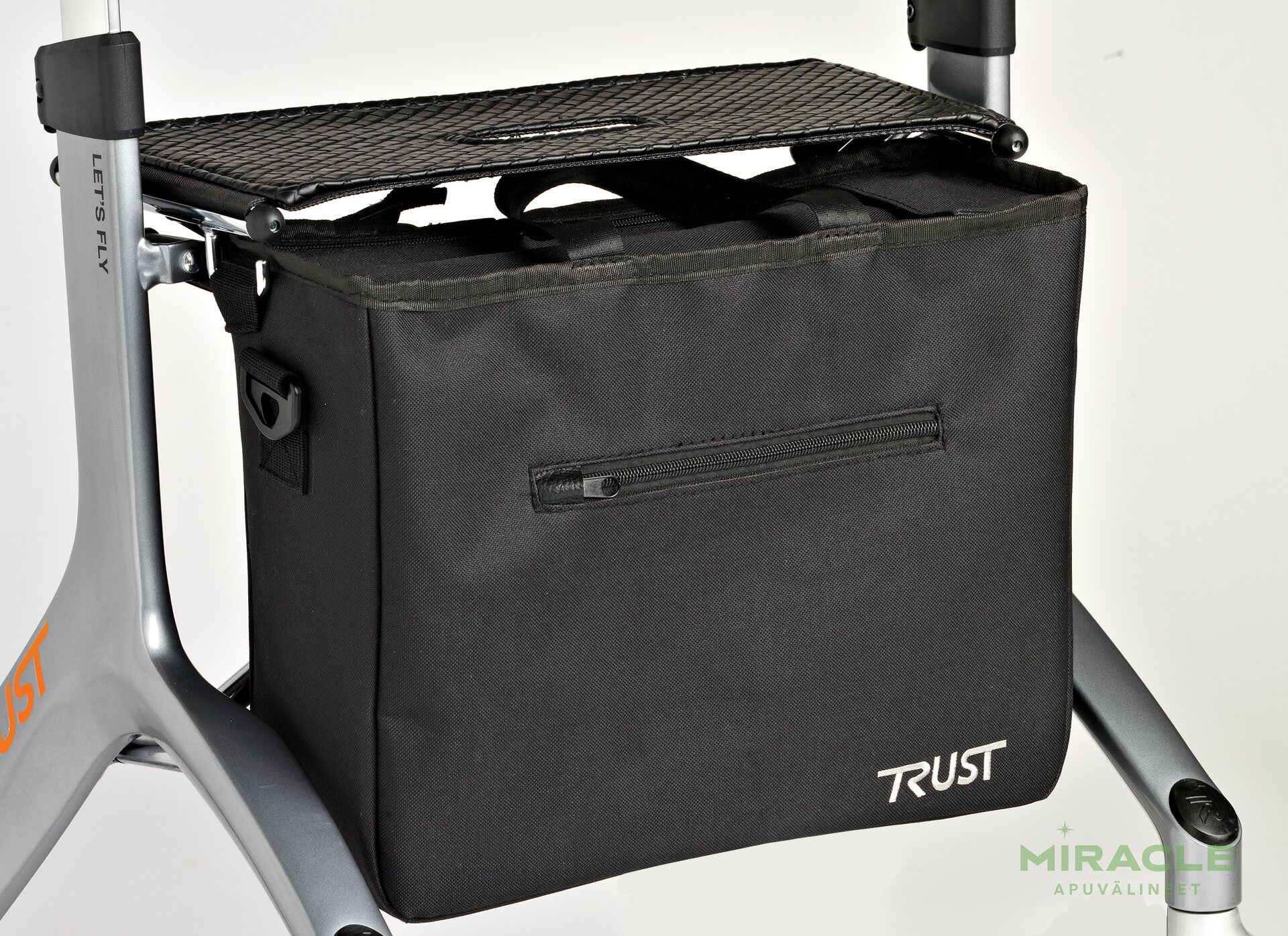 Ostoskassi/laukku Let's Fly -rollaattoriin. Laukku on helppo irrottaa sekä kiinnittää rollaattoriin siinä olevilla lenkeillä esimerkiksi kaupassa asioidessa. Valmistusmateriaali on kestävää kangasta ja sen max. kuormitus on jopa 12 kg. Laukku suljetaan vetoketjulla ja siinä on lyhyet kantokahvat sekä pidempi olkahihna. Lisäksi siinä on vetoketjullinen sivutasku.