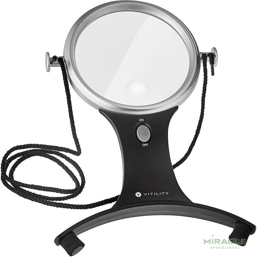 Tämä suurennuslasi jättää kädet vapaaksi vaikka käsitöiden tekemiseen. Kaulanauhan avulla suurennuslasia voi pitää rintaa vasten, jolloin kädet jäävät vapaaksi vaikkapa kirjan pitelemiseen. Suurennuslasissa on myös LED-valo näkyvyyttä parantamaan. Paristot eivät sisälly pakkaukseen. Suurempi linssi suurentaa 1,5x ja pieni integroitu 6x suurennus. Suurennuslasin linssin halkaisija 10 cm.