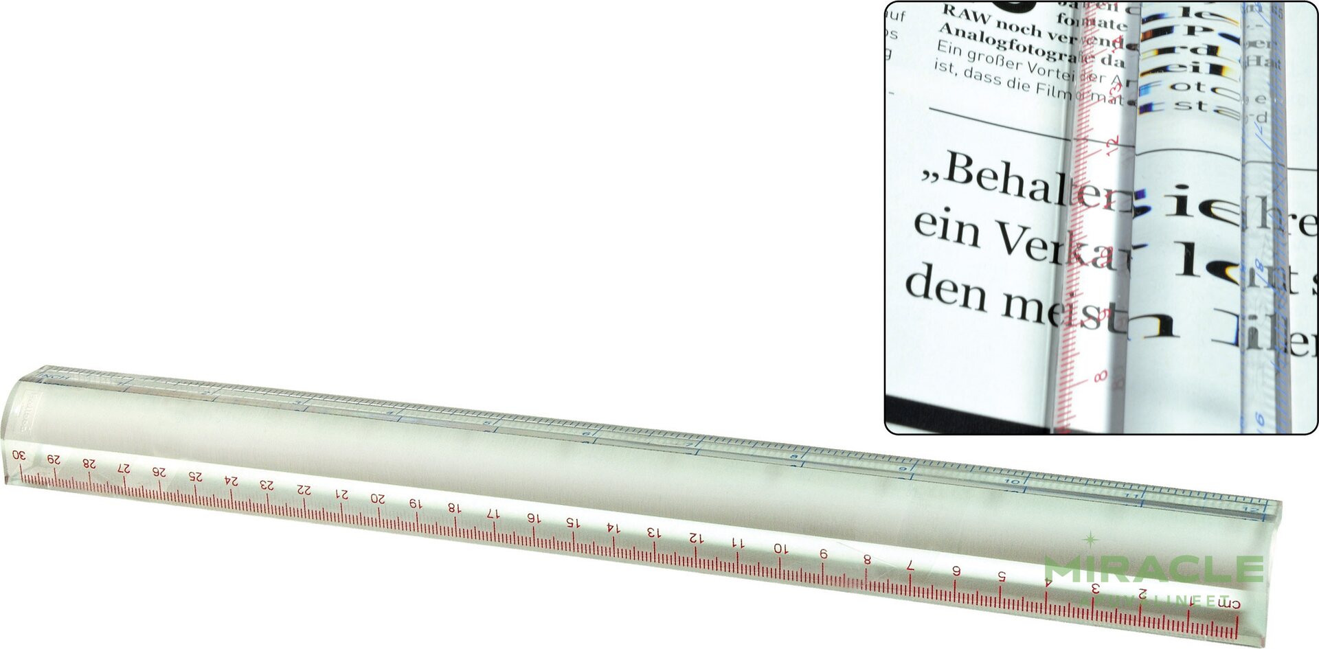 Viivainsuurennuslasi on kätevä apuväline lukemiseen. Suurennuslasi helpottaa tekstien lukemista rivi riviltä. Lasi tarjoaa 2-kertaisen suurennuksen ja sen koko on noin 300 x 35 mm.
