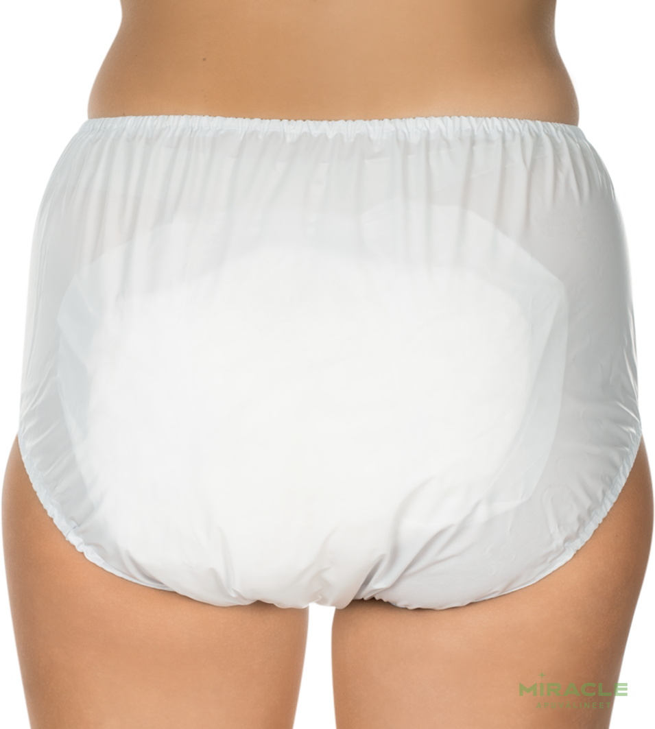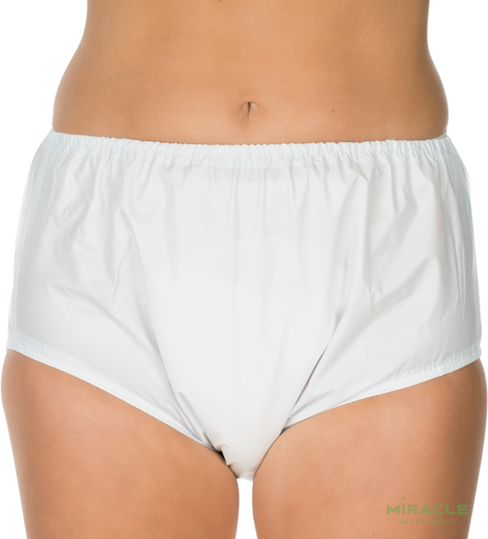 Näitä kosteudenkestäviä PVC-housuja voidaan käyttää sekä kertakäyttöisten pehmusteiden kiinnityshousuina että lisäsuojana vaippojen päällä vaikean virtsan- ja ulosteenpidätyskyvyttömyyden sattuessa. Kapea joustava vyötärönauha ja lahkeet sekä kuumasaumatut sivusaumat tarjoavat suojan vuotavilta nesteiltä. Housut sopivat miehille ja naisille.