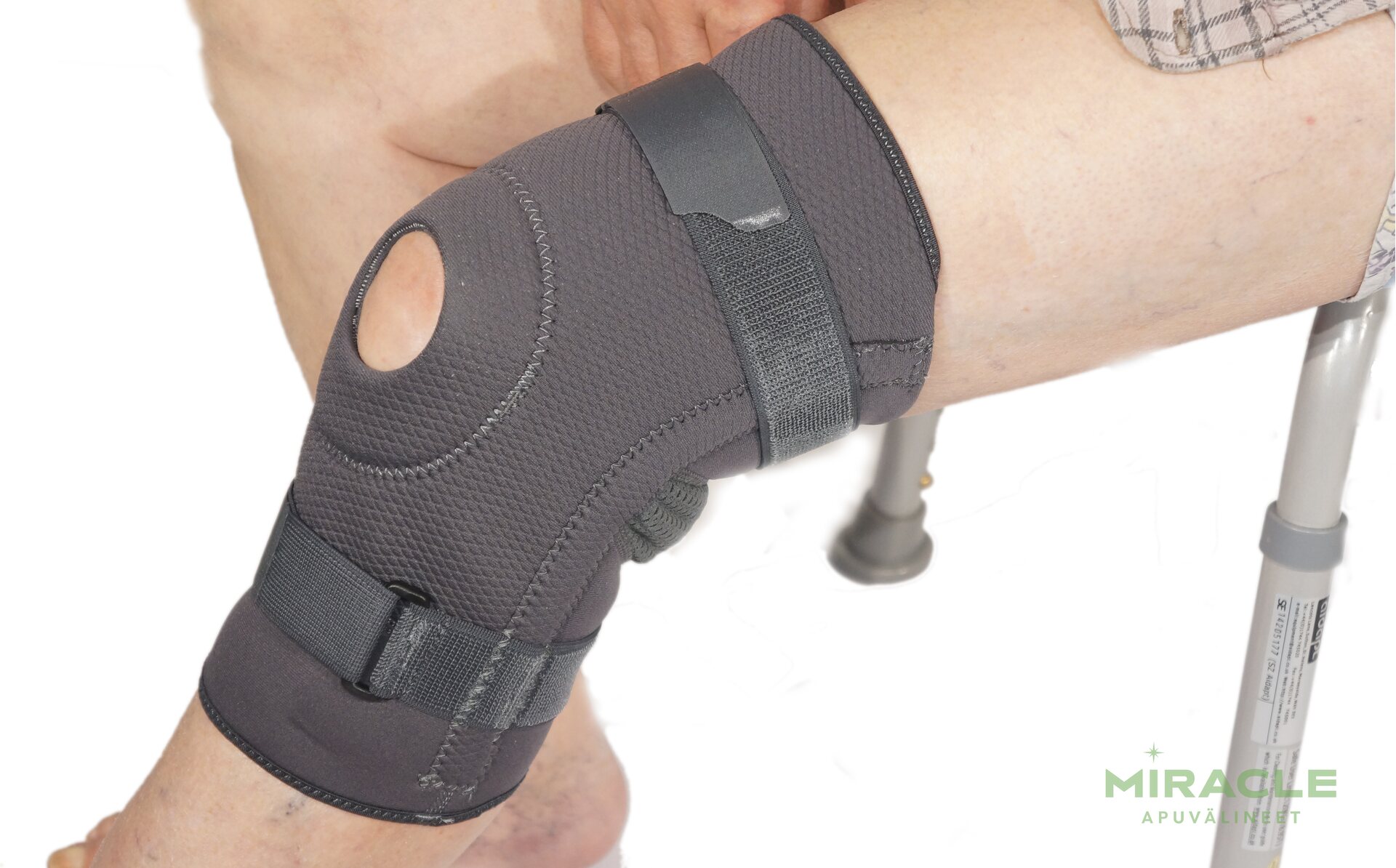 Polvituki on varustettu vahvistetulla lumpioaukolla ja kahdella elastisella kiristyspannalla, jotta se pysyy hyvin paikoillaan. Polvinivelen takana on ilmanvaihtoa ja joustavuutta lisäävä verkkokangas.