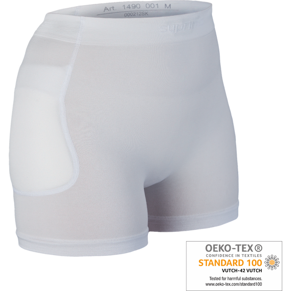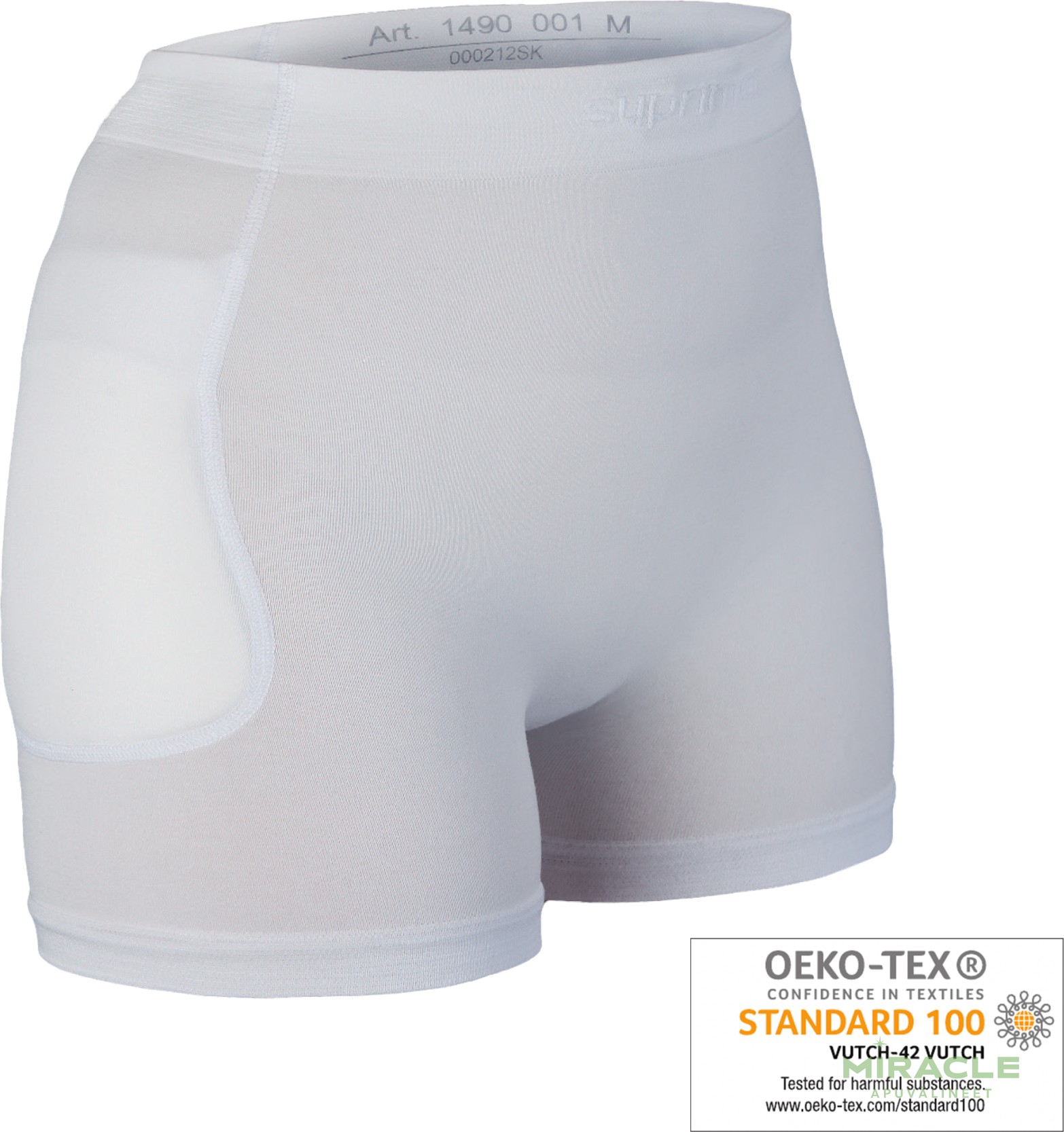 Lonkkasuojahousut yhdessä suojakilpien kanssa tarjoavat suojaa kaatumisista aiheutuvia lonkkamurtumia ja vammoja vastaan. Housuissa on erityiset sivutaskut suojakilville, jotka on sijoitettu varmistamaan optimaalisen suojan. Malli sopii sekä miehille että naisille, ja housuja voi käyttää huomaamattomasti omien vaatteiden alla ilman, että ne tuntuvat paksuilta tai epämukavilta. Housut on valmistettu saumattomalla pyöröneulostekniikalla yhdestä kappaleesta, mikä tekee niistä erittäin kestävät. Leveä ja pehmeä vyötärönauha lisää käyttömukavuutta entisestään. Lonkkasuojakilvet myydään erikseen.